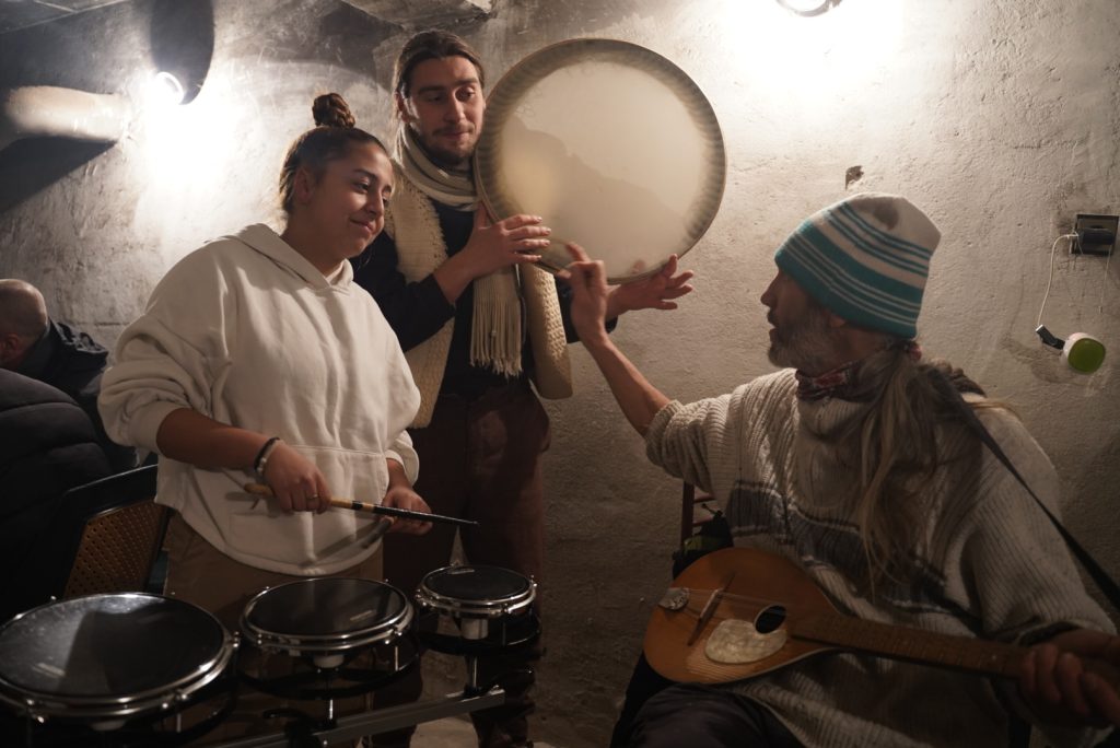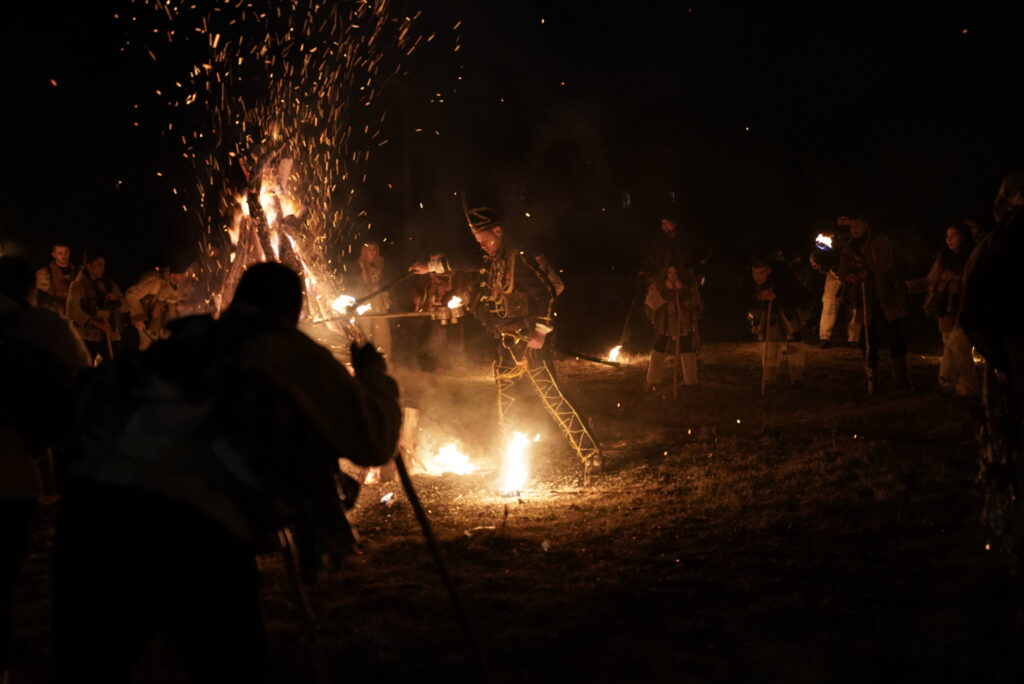 Около гладата започват заедна да дрънкат с чановете и мятат запалените си факли в огъня.